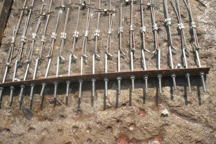 高強鋼絲繩網(wǎng)片—聚合物砂漿加固法,是用固定釘將高強度不銹鋼絞線(xiàn)網(wǎng)固定在原構件上,并用緊線(xiàn)器對鋼絞線(xiàn)網(wǎng)進(jìn)行預緊,在加固構件表面噴吐一層粘結劑后,將滲透性聚合物砂漿噴涂在加固構件表面的一項加固技術(shù)。 鋼絲繩網(wǎng)片的高強性和聚合物砂漿良好的粘結性能和耐久性使得該項技術(shù)可以提高混凝土梁、板的抗彎和抗剪承載力,提高粱、板的抗彎剛度,對混凝土梁、板構件的裂縫的產(chǎn)生和發(fā)展有明顯的抑制作用??梢蕴岣咧?、剪力墻以及磚砌墻體的抗壓以及抗剪承載力,可以提高混凝土柱的軸壓比,抑制墻體裂縫的發(fā)展。適合建筑物和橋梁的加固補強。
